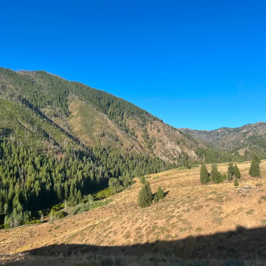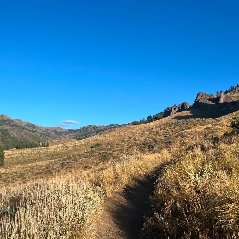 Enter onto an open hillside and the climb intensifies. As the trail winds along, beautiful views open to the north and there are over-the-shoulder views back towards Ketchum.