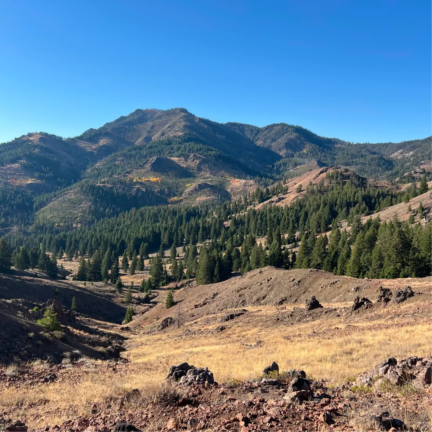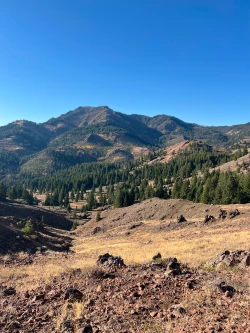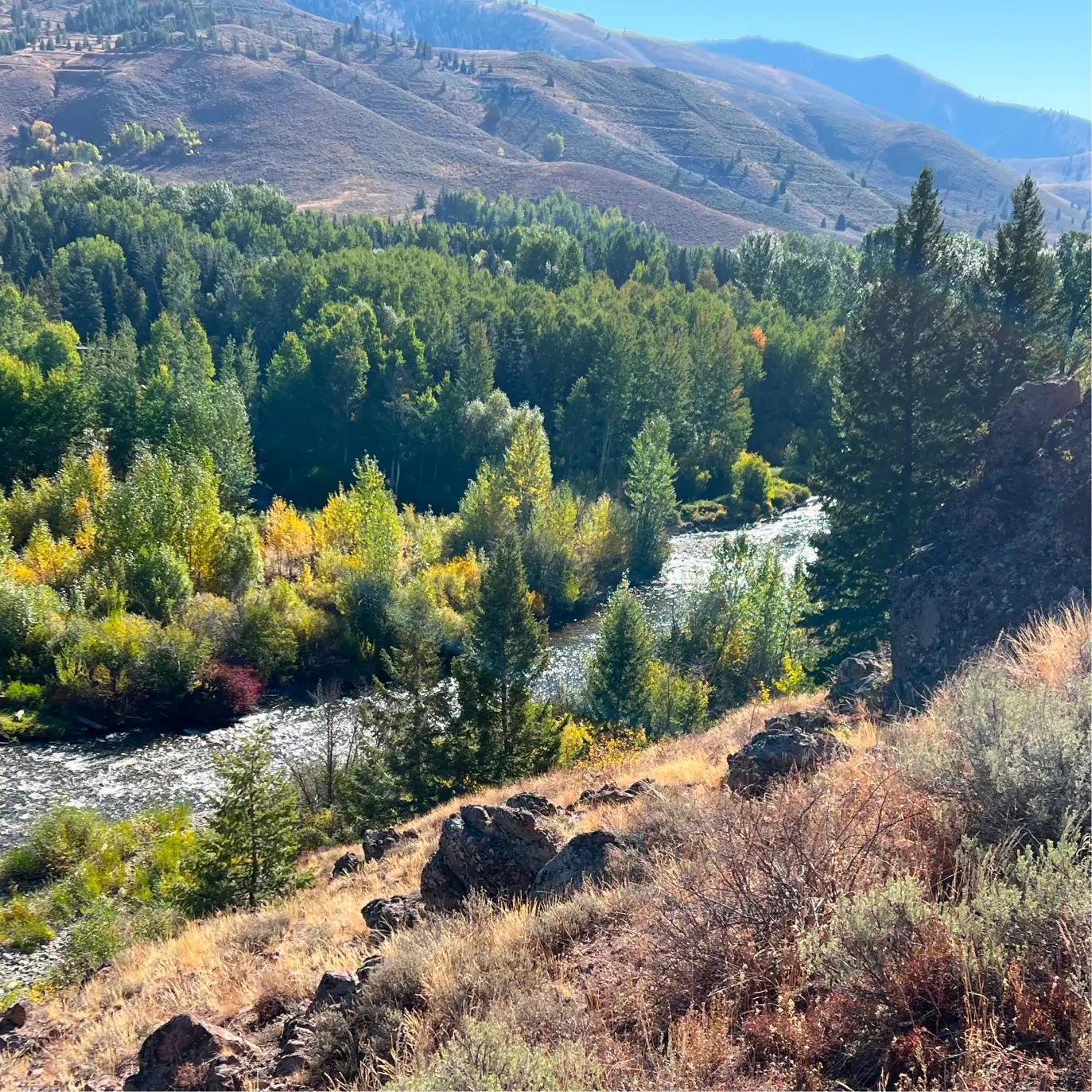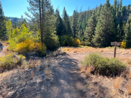 Begin another ascent, climbing about 150 feet over a quarter mile. The trail flattens out around 3.6 miles as you enter another small patch of pine trees. The trail cuts along a ridge halfway between the peak and the river below. The trail then rolls along, mainly descending, as you pass through the woods and some open areas. At 4 miles you will cross a bridge over a stream and shortly afterwards enter an open field strewn with boulders. As you continue, excellent views of the Big Wood River open to your right. At 4.25 miles, a signed junction marks where North Fork reconnects with Chocolate Gulch.