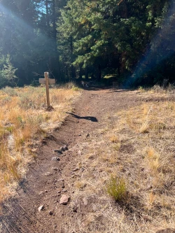 At the 1.8-mile mark, the descent intensifies as you scramble over rocky intrusions. Much of the descent is in the open sun, though a few pine groves offer shade along the way. At 2.45 miles, you will come to s signed junction with the Oregon-Fox Connector. Stay left and shortly afterwards enter the woods for a short stretch.