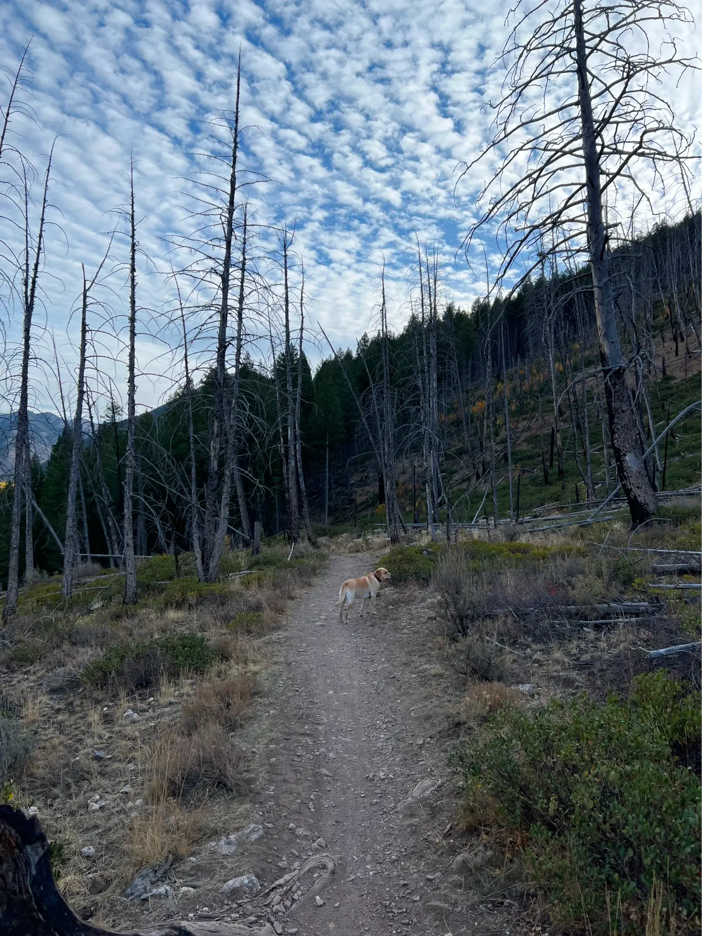 As you descend the short hill, you will hear Trail Creek flowing from down the slope to your right. As you complete the wide left turn, Bald Mountain will dominate the horizon before you. The trail continues along the right edge of the top level of the meadow and eventually the beautiful Trail Creek comes into view. Just after the 2-mile mark, there is a four-way junction. If you have a dog, we suggest taking a right turn and heading down the hill towards the creek. At the bottom of the hill, take a hard left turn to continue along the path. At 2.2 miles, there is an excellent watering hole for dogs.