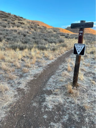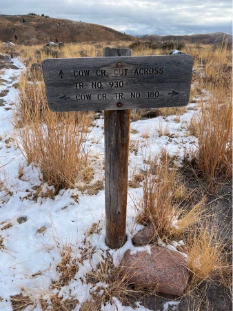To find the trailhead, put your back to the large map and information sign in the parking lot, walk straight up the small hill and look for small sign that reads, “Cow Cr. Tr. No. 180.” The trail begins with a gentle rise through a meadow and curves to parallel a fence line to your right. At .45 miles the climb gets significantly tougher as you turn to the left and begin ascending the hills.