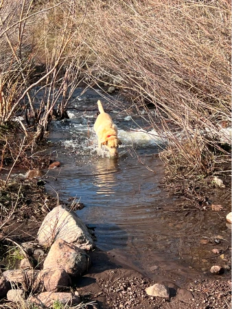 At 3.15 miles there is a pond which dries up by midsummer. When filled, it is a fun spot for dogs to play. The trail at this point is rolling, but with quick bursts of descent along the way. At about 3.4 miles, come to an unsigned junction and stay right.