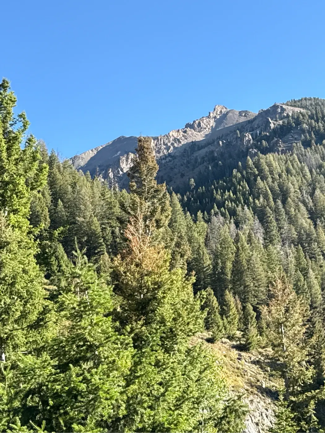The trail alternates between forest and open hillside. As the skies open, the views of the Boulder Mountains improve. Just after the mile mark, the river runs close to the trail.