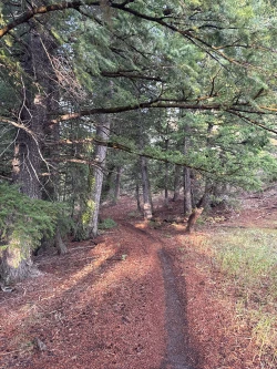 During wet season, there are a couple of areas along this section that may require a simple crossing. The stream nestles up to the trail at 1.5 miles and again at about 1.75 miles. Finally, at 1.9 miles, come to the final destination under the welcome shade of tall Douglas fir trees. This is an excellent spot to stop and enjoy a picnic.