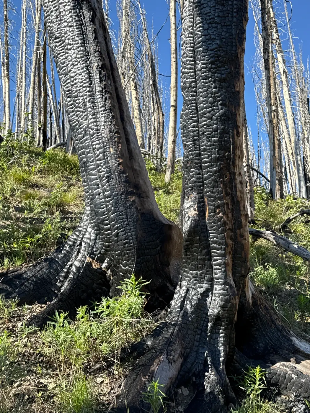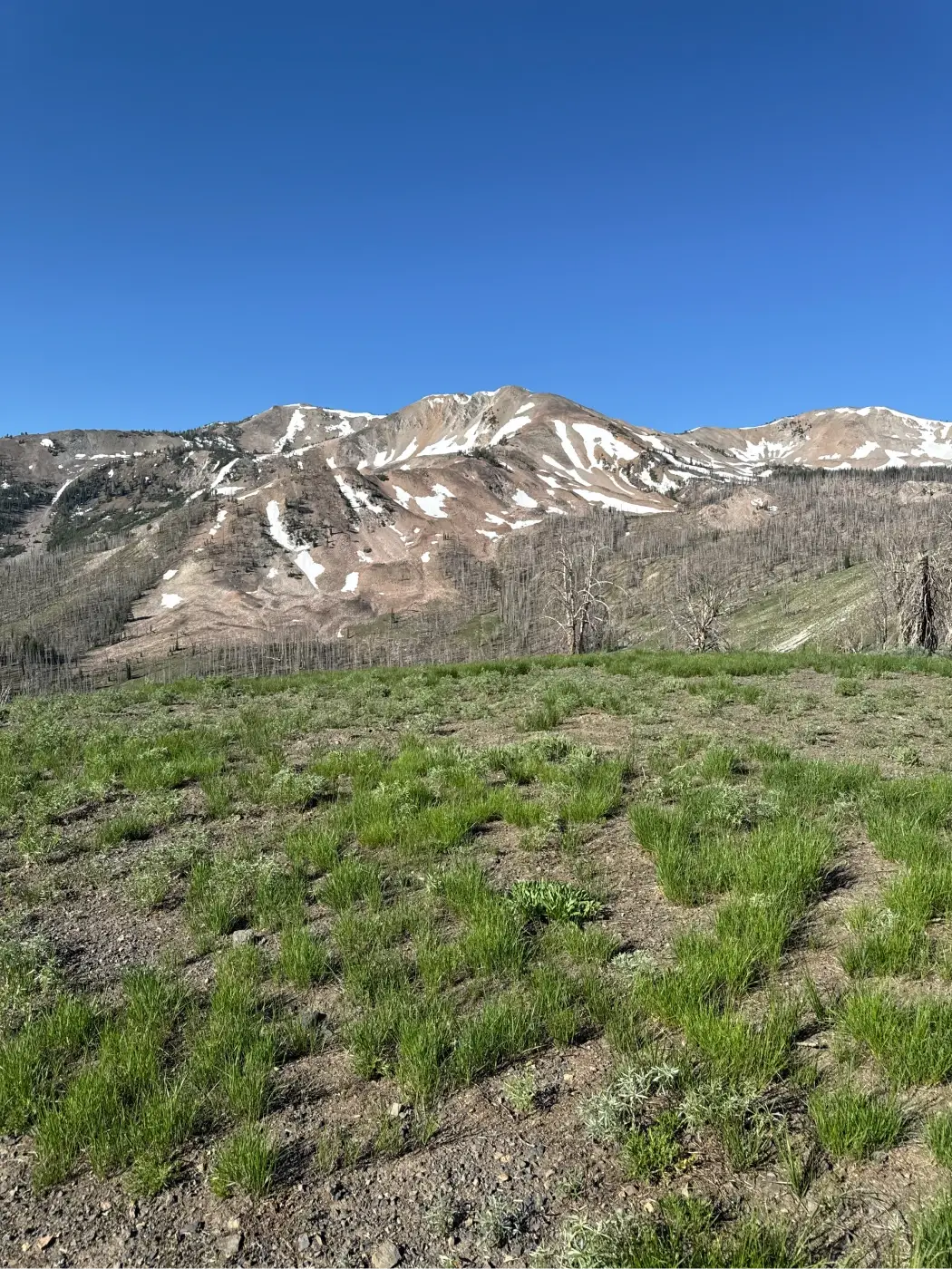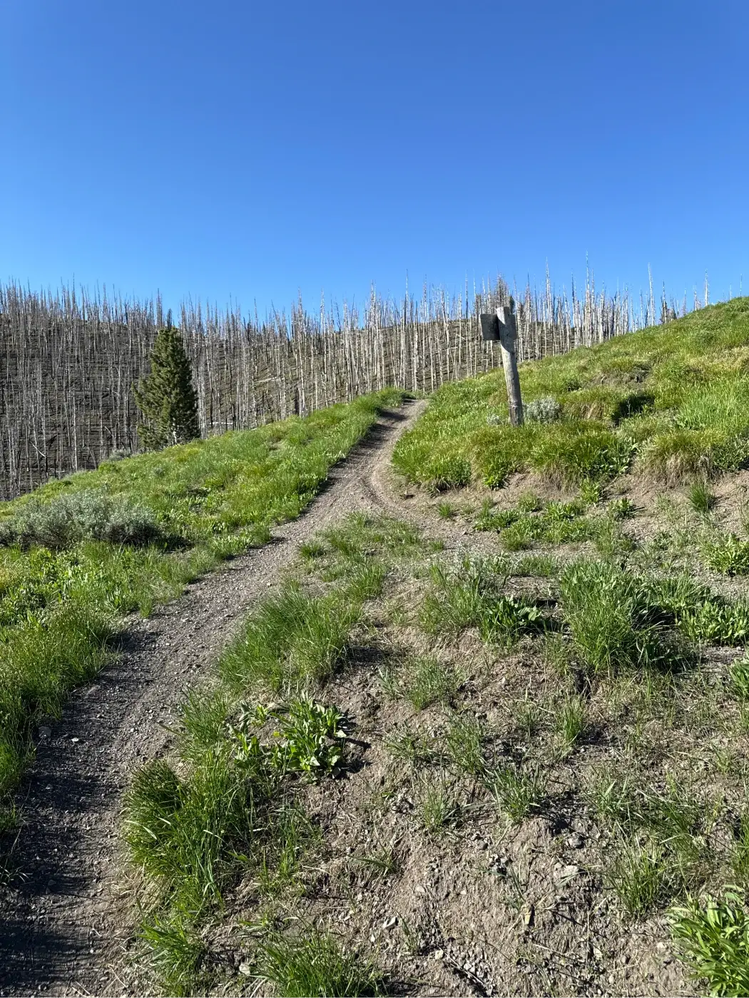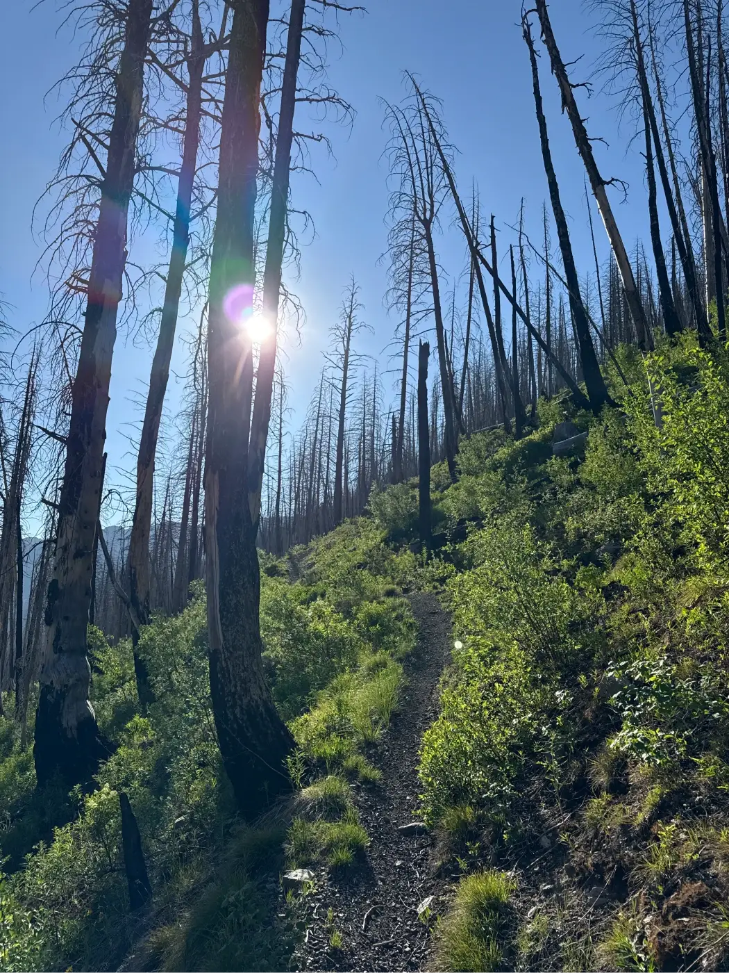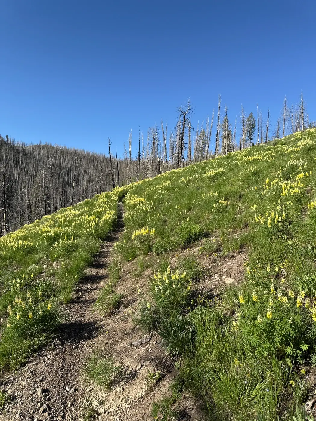 The trail cuts through the middle of an open hillside before leveling out as it reaches another section of the fire-damaged forest at about 1.65 miles.