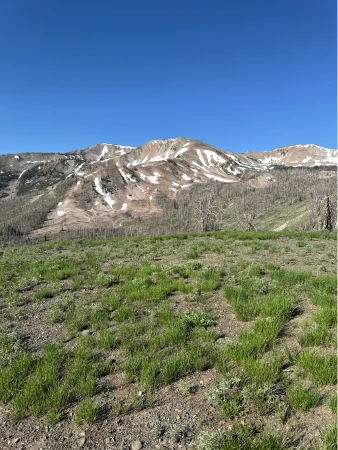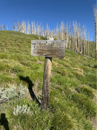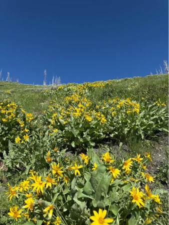 At about .35 miles, cross a bridge spanning a small ravine and continue to pass through the blackened forest. Shortly before reaching the mile mark, you exit the tree line and enter a hillside meadow exposed to the sun. In mid-summer, this area is covered in buckwheat, lupine and other wildlflowers.