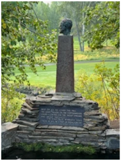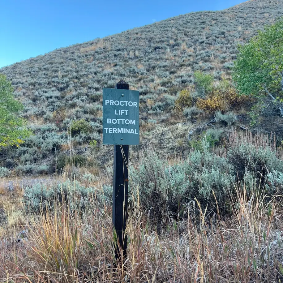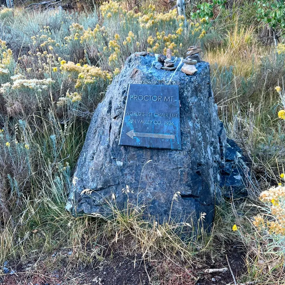 The trail narrows and steepens somewhat as you pass through aspen groves. Just before the mile mark, you will come to a plaque commemorating the world’s first ski lift and shortly after that a sign marking where its bottom terminal used to sit.