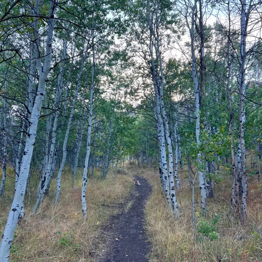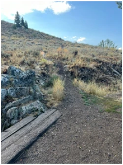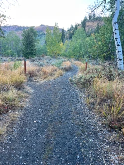 Shortly after the U-Turn, there is an offshoot to the right that leads to a bench memorializing Kim Germer-Prew, a Sun Valley local and hiking enthusiast who passed away in 2014 after battling cancer. Shortly before the 3-mile mark, you will come to a posted junction with South Aspen/Aspen Loop. Turn left.