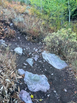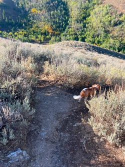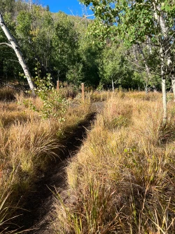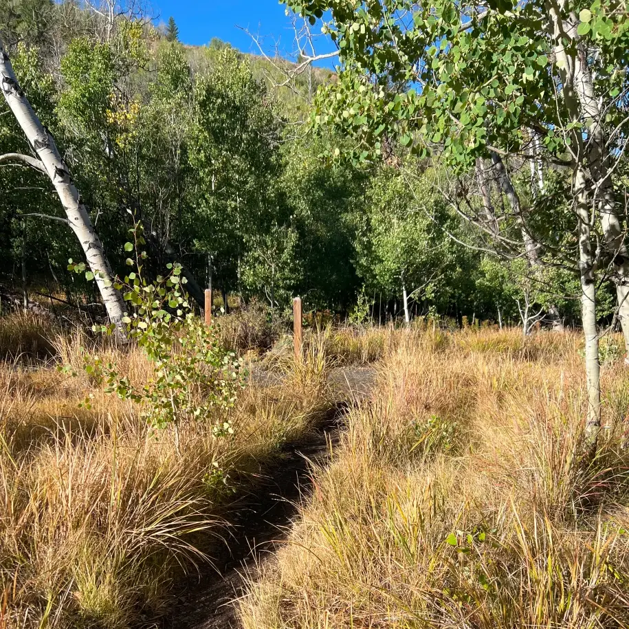 As you wind around the hillside, you will see Trail Creek Cabin to your left. After a short descent, you will come to a four-way junction at .4 miles. The trail straight ahead takes you to South Aspen and the path to your left leads to Corral Creek. Turn right and go up a small hill.