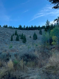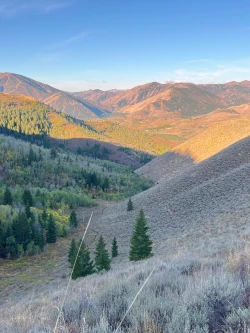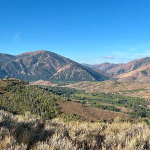 From here, the trail slightly descends along an open mountain top covered in sage. Magnificent views of Bald Mountain and much of the valley open as you continue down the hill.