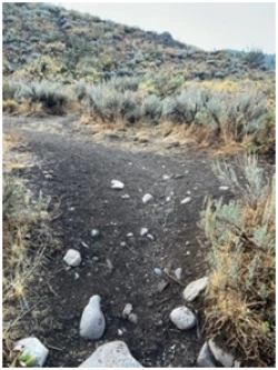 The trail steepens again as you pass in and out of wooded sections. At 1.3 miles there is a watering hole just to the right of the trail, though it can run dry during droughts. At 1.5 miles the trail steeps again. Rising before you in the distance is a sage-covered ridge. You will eventually cross through the middle of it to get to the hike’s peak.