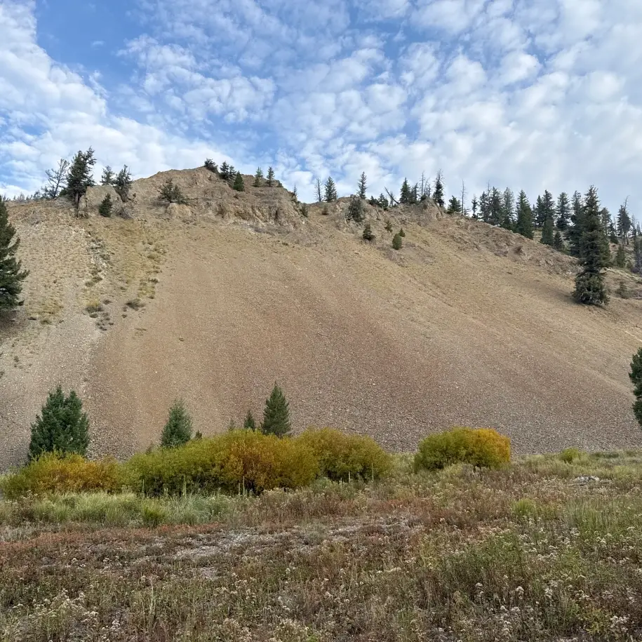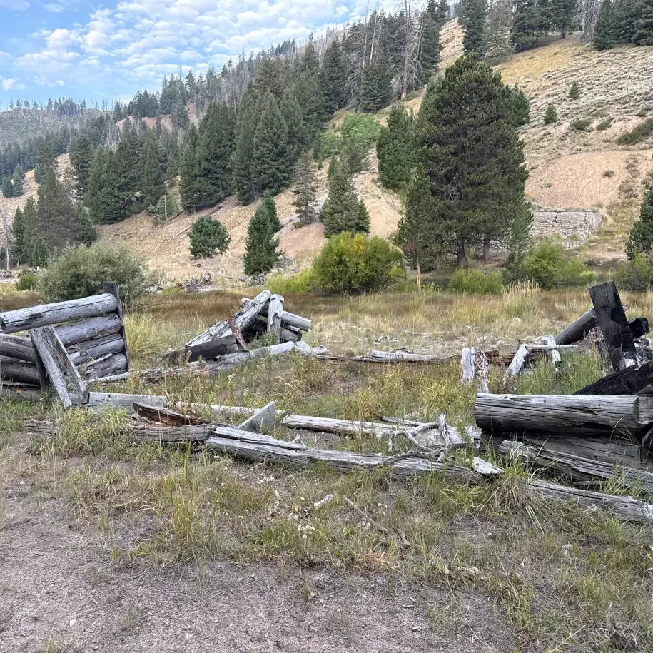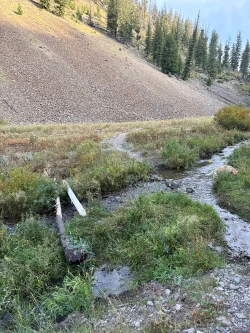 There is an easy water crossing just before the mile mark and the trail briefly enters the woods before entering another large meadow which features a few old mining structures.