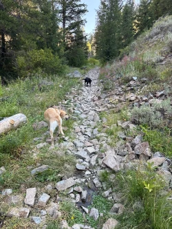 Rooks Creek is a pleasant stroll through a small, secluded gully. The sunny hike crosses a series of meadows which are filled with wildflowers during the mid-summer. One meadow just past the mile mark features a series of old mining structures and is an excellent destination for a shorter hike. Our route ends at a peaceful junction with the creek – a nice spot for a picnic. The trail continues another 2.5 miles from that point and, after a very difficult climb through charred forest, connects with Osberg Ridgeline trail.