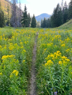 At .7 miles, the gully widens as it comes to the first of a series of meadows. Wildflowers are abundant in July and early August.