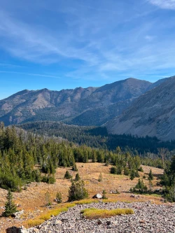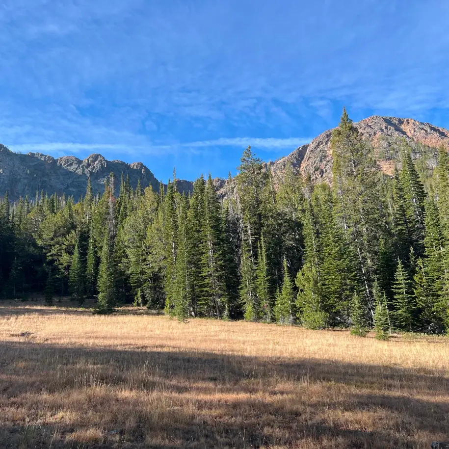 Enter a large meadow at about 1.75 miles with excellent views of the rising Pioneer Mountains before you. Re-enter the forest at 2.2 miles and then another small meadow before entering the forest again at 2.5 miles.