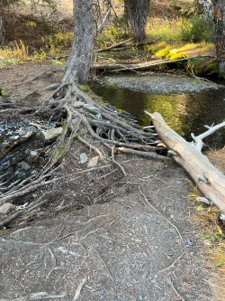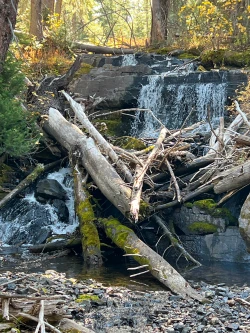 The trail wanders through a mixed forest as the creek runs to your left, often pooled into wetlands by a series of beaver dams. As the trail continues its easy rise, listen for a waterfall at about 1.3 miles. There is no clear path to the waterfall, but walk over an open area of small fallen trees for about 75 feet to find the tiered falls.