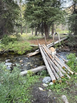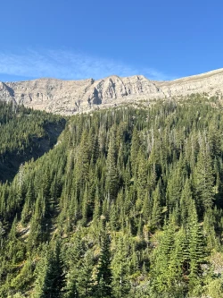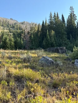 Cross a small stream just before the 1.25-mile mark and begin the toughest part of the hike as the trail jumps up through the woods. At 1.45 miles cross another small stream and enter a large, hillside sagebrush field. This area is filled with wildflowers during mid-summer. There are stunning views of the Boulders to your left and an idyllic river-cut valley lays below. The trail gets faint through the field, but look for cairns to guide your way.