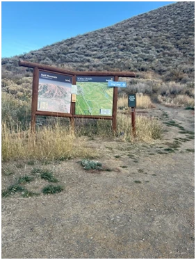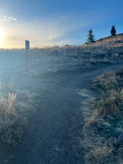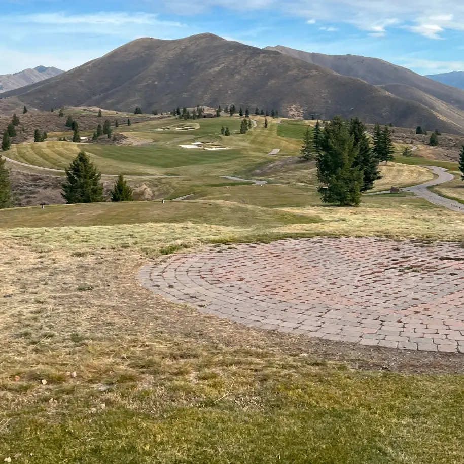 Moving along the trail, views of downtown Ketchum appear, the city laying at the bottom of Bald Mountain. At 1.7 miles the White Clouds golf course comes into view. The trail continues to wind along the hillside. At 2.3 miles, take the junction left and take the short climb to the destination, a grassy area with views down the White Clouds difficult 5th hole. There is a bench honoring Kelley Elizabeth Goldmanis, a young woman who died of cancer in 2021. Her memory is marked with a reminder to “Look around, take a deep breath. . .”