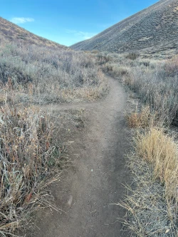 At about the 1.35-mile mark, come to the first of three sweeping turns that follow the contours of the valleys as they cut through the hills. Where the turns tighten, there is often water running down the drainage. It is not recommended to let your dog drink this water, as it is runoff from the White Clouds golf course which is built into the hills above.