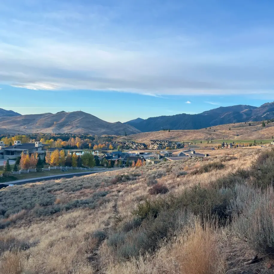 The high road marks the start of a pleasant gently rolling ridgeline walk over a valley that hosts a few Big Wood mansions. As you continue along, the Bigwood Golf Course becomes visible and the Wood River Valley opens in front of you offering views as far as the Adam’s Gulch trailhead and the tree-covered Smoky Mountains.